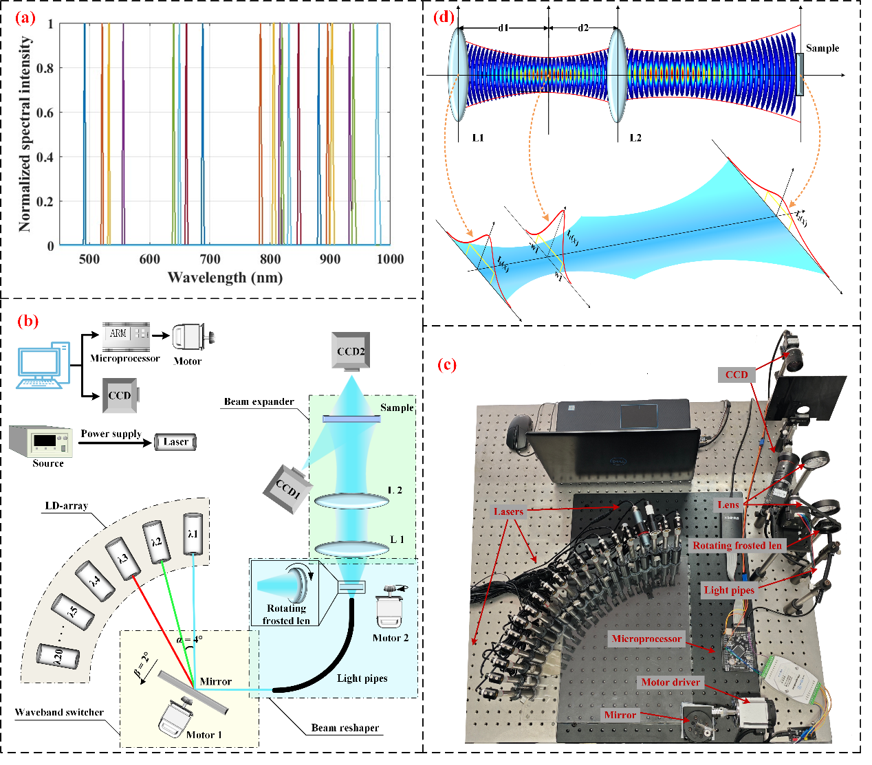针对上述限制,该研究提出了一种替代性的照明策略,创新性地构建了激光高光谱成像系统(LHIS)。该系统并未采用昂贵的机械扫描或可调滤波器,而是利用20个离散的、可切换的窄线宽激光(覆盖400-1000 nm范围)作为光源。