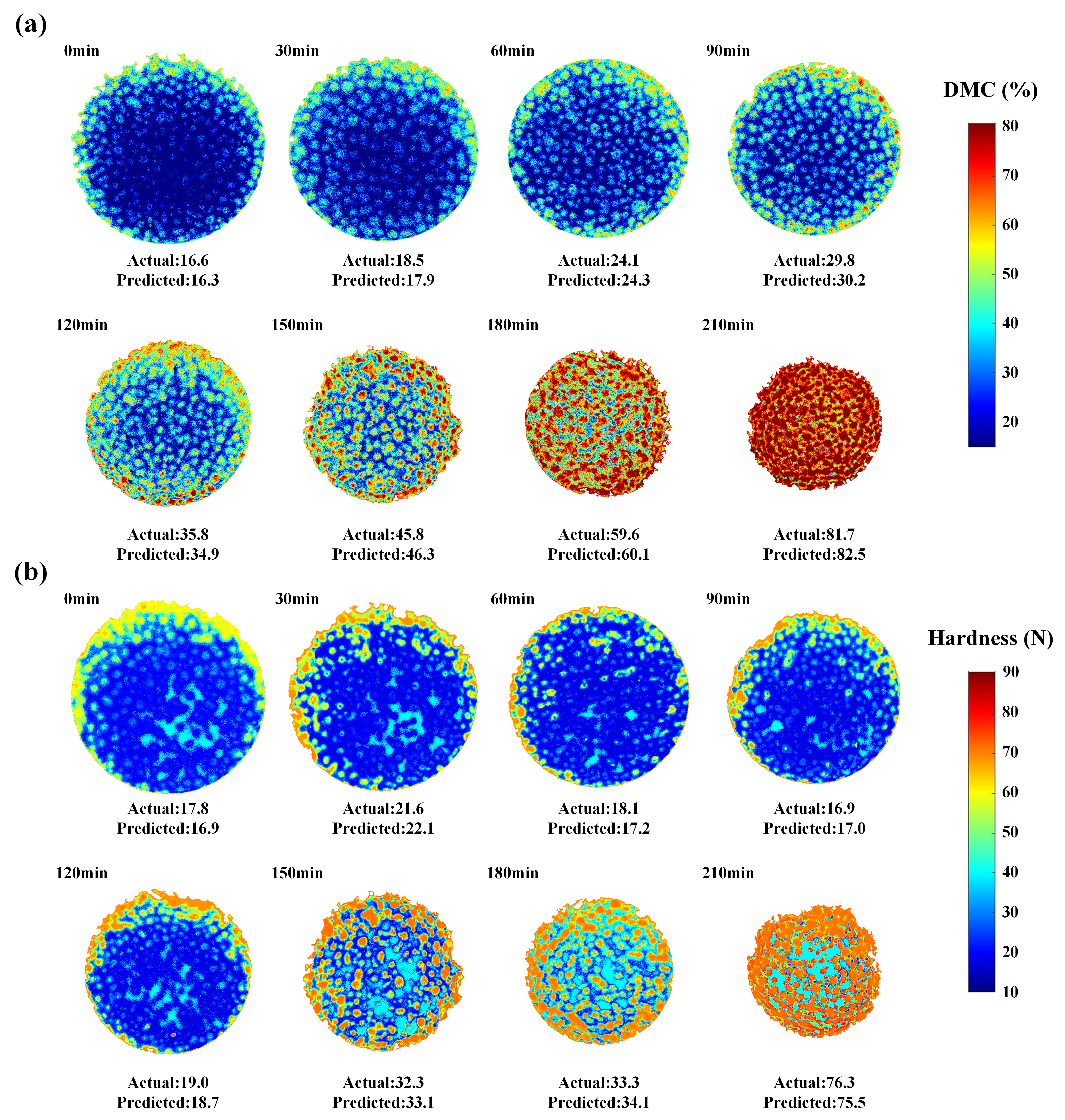 为了验证系统的鲁棒性,团队选取了具有复杂生化特性的山药(Yam)作为研究对象,对其在60°C热风干燥过程中的干物质含量(DMC)和硬度进行监测。山药干燥涉及粘液多糖、淀粉糊化及褐变等复杂变化,对检测系统的稳定性要求极高。研究通过LHIS系统同时获取了透射和反射高光谱图像,并对比了PLS、ELM、RF和XGBoost等多种算法。结果表明,透射模式在各项指标上均优于反射模式。其中,PLS算法在预测DMC方面达到了极高的精度(R²=0.98),XGBoost算法则在硬度预测中表现最佳(R²=0.938)。