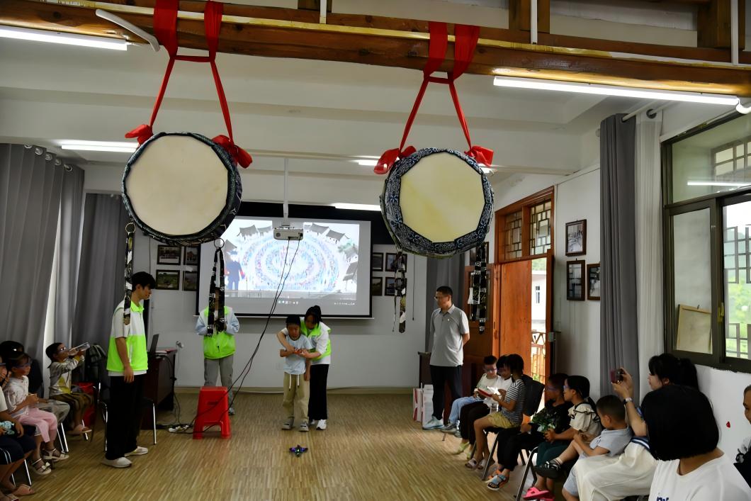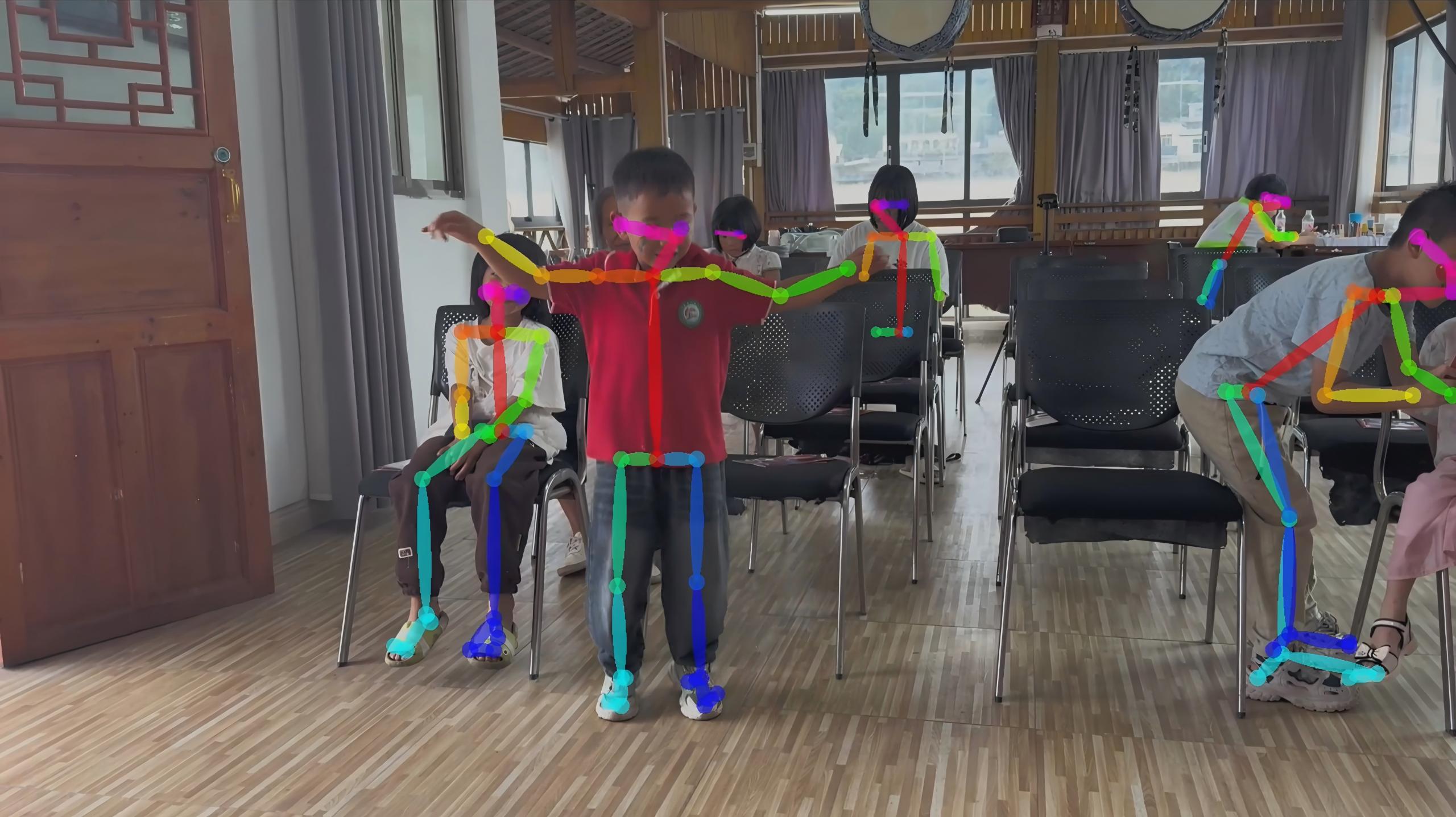 在实践体验环节,村委会变身“科技小乐园”。孩子们在队员的指导下,使用智能传感鼓槌参与“击鼓挑战”,感受科技与民族文化的碰撞。此外,团队自主研发的“数智青鸟”非遗动作分析平台也首次亮相。该系统通过高精度骨骼点捕捉与实时可视化分析,为当地非遗(如舞狮、布依戏)的活态传承提供技术支持。孩子们学习动作时,系统化身“AI教练”,即时生成动态图谱并与标准范式比对,显著提升了学习效率与兴趣。