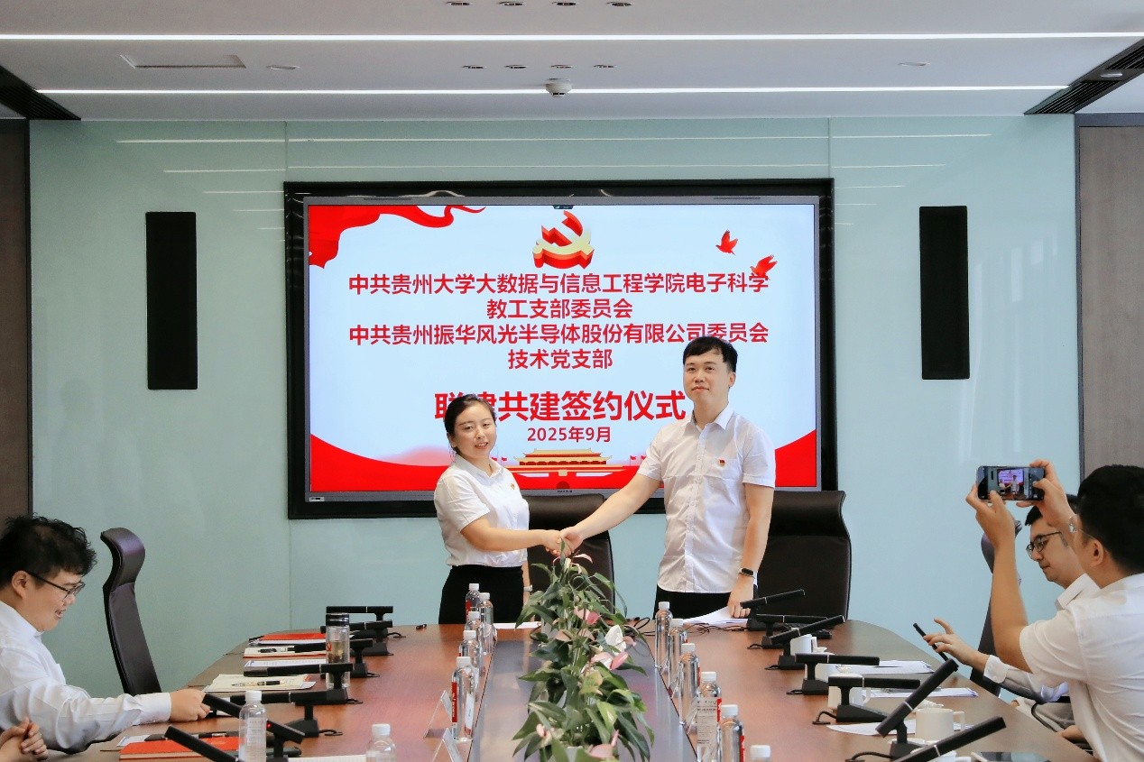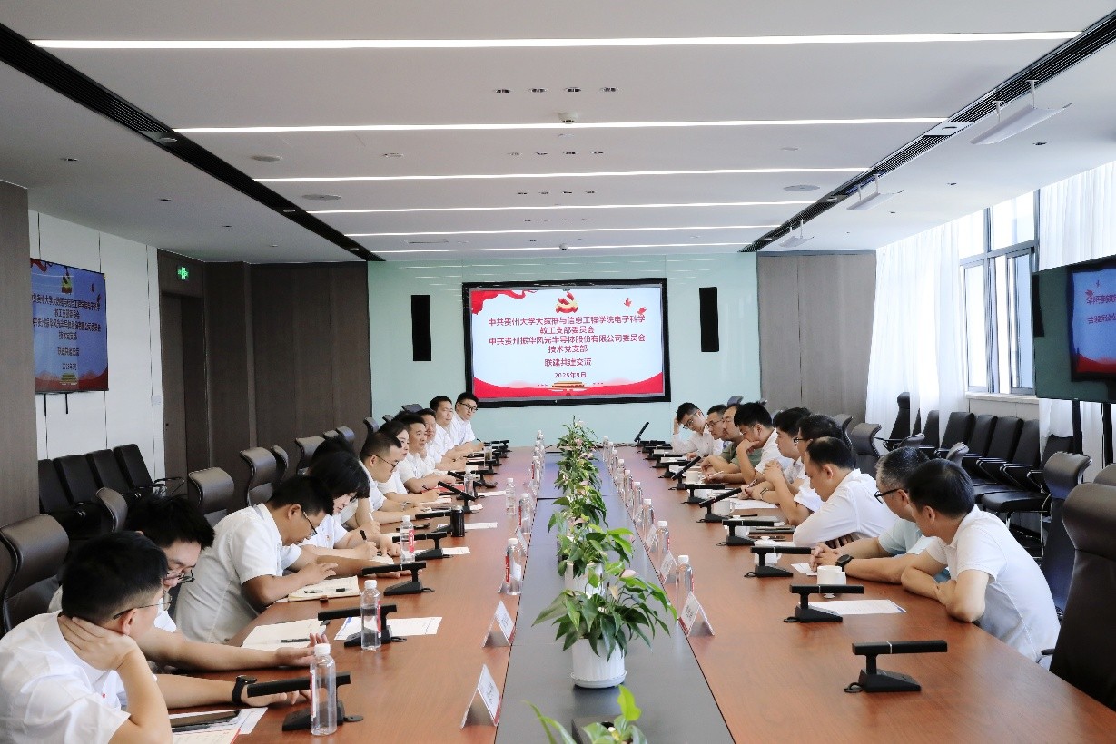 (电子科学系教工党支部 供稿)9月17日上午,贵州大学大数据与信息工程学院电子科学系教工党支部(以下简称“电科系教工党支部”)与贵州振华风光半导体股份有限公司技术党支部(以下简称“振华风光技术党支部”)开展支部联建共建,双方围绕党建工作、深化产学研合作、共促科技成果转化等方面进行了深入交流。