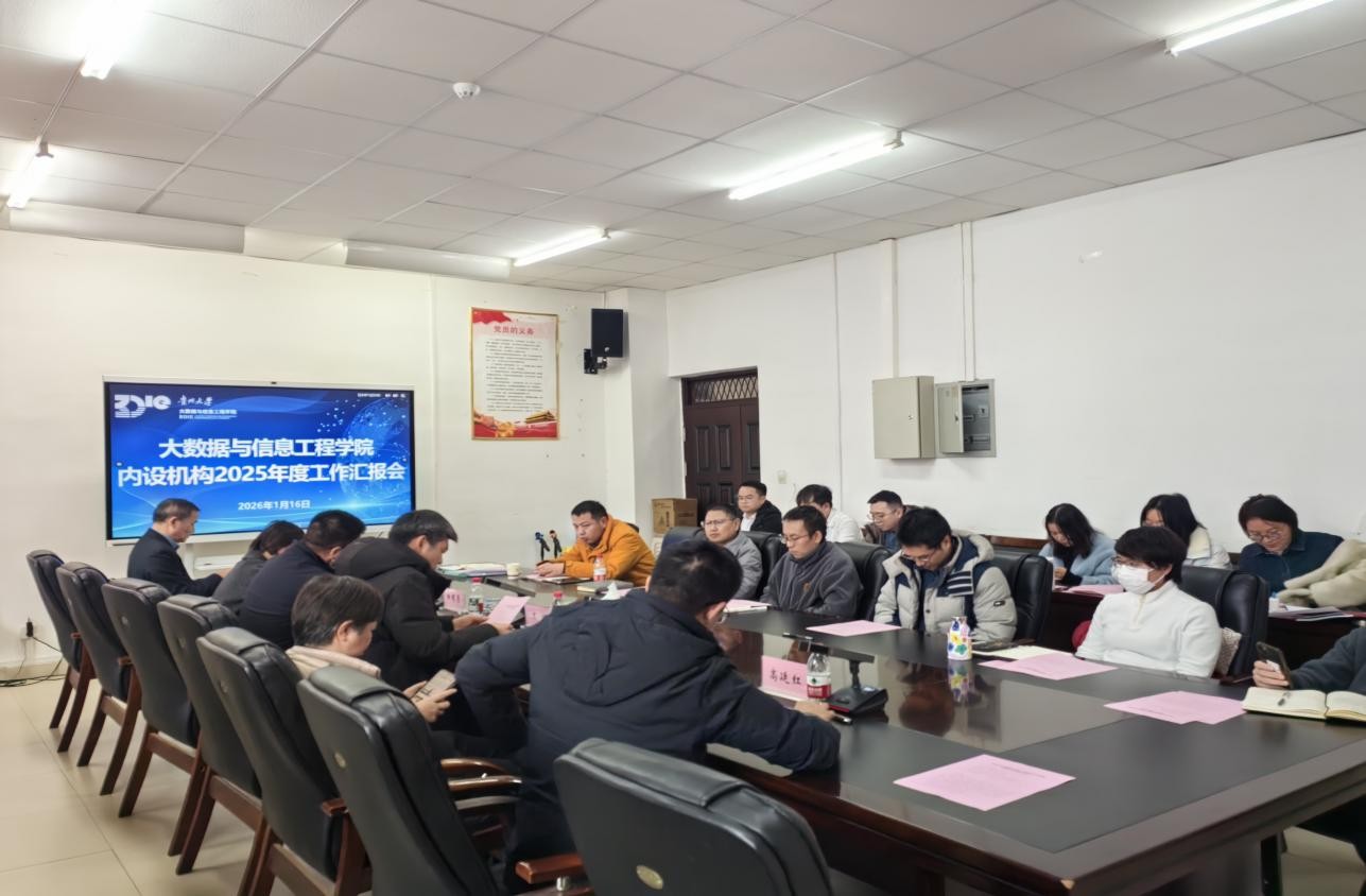 (党政办 供稿)2026年1月16日下午,贵州大学大数据与信息工程学院年终述职会议在崇理楼311会议室召开。院党委书记王珂主持会议,院长田有亮、正处级组织员江河、党委副书记兼纪委书记张羽岚、副院长高廷红出席会议,院属各党支部书记、各科室负责人、各系(中心)主任及教研室主任参加会议。